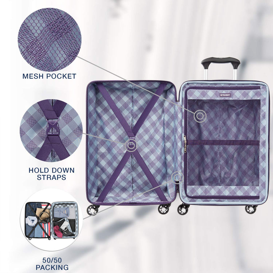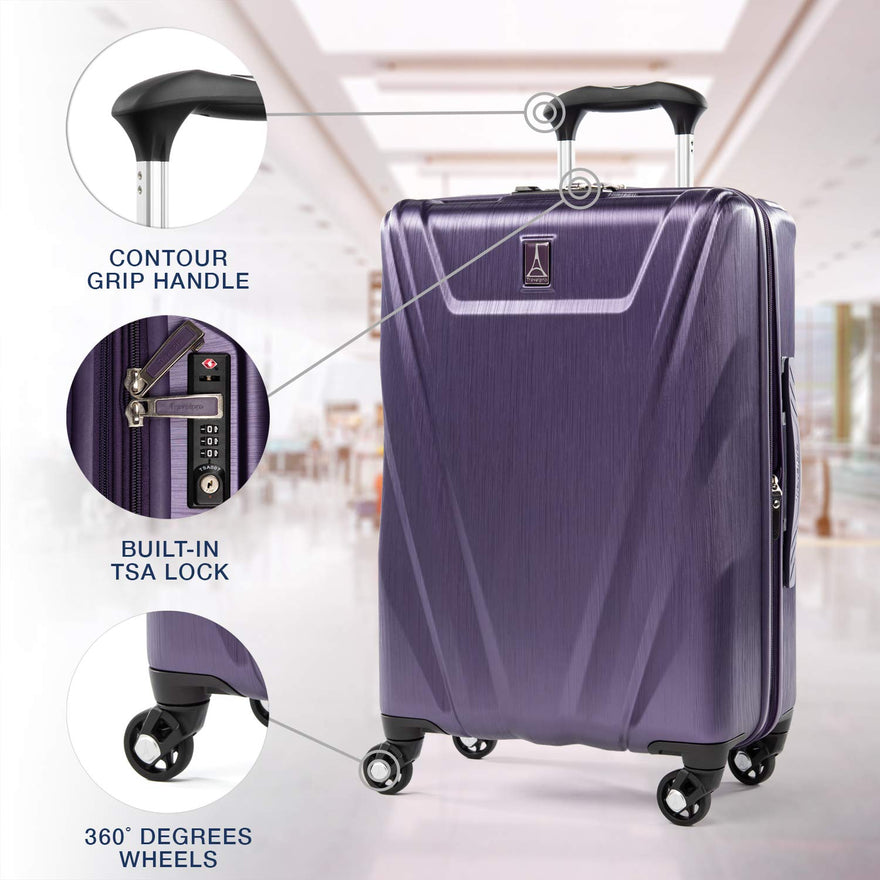 Details: Finally, an expandable, hardside carry-on bag that is ultra-durable and ultra-light! The Maxlite 5 expandable carry-on hardside spinner is designed to meet carry-on size restrictions for most domestic airlines while maximizing how much you can pack inside with its convenient 2” expansion option. The ultra-durable, ultra-lightweight polycarbonate shell is specifically engineered to be flexible upon impact, protecting contents while resisting cracking or splitting. Additional exterior Features help protect the bag from wear and tear, including the shell’s textured surface, which helps reduce visible scratching or scuff marks, and molded corner Guards that serve as built-in bumpers on high-wear points. An integrated TSA-compliant lock keeps contents secure and allows authorities to unlock and relock the suitcase without damage when needed for inspection. This bag is great for shorter and medium-length trips, with a split case Construction and interior divider panel that provides separate packing compartments. Elastic hold-down straps keep everything in its place. Roll with ease on four 360° spinner wheels guided by the lightweight, height-adjustable PowerScope Lite handle with comfortable Contour grip. Backed by Travelpro built for a lifetime limited with our trusted companion promise.