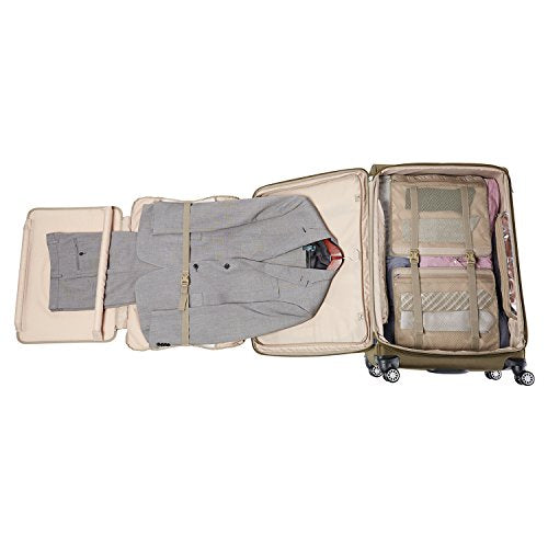 Details: The epitome of style, Travelpro Platinum Magna 2 luxury performance luggage is crafted with premium, ultra-durable fabrics and intelligent design innovations, making it ideal for frequent business travel and personal trips. This checked suiter bag is our largest size, but it’s still easy to maneuver through the airport with eight MagnaTrac self-aligning wheels that provide effortless 360-degree rolling whether you’re arriving or departing. The large capacity ensures there is room to pack everything you need for longer trips or multiple people, and the bag can be expanded incrementally up to two inches for even more storage. The upright suitcase also features a patented telescoping handle that extends to three lengths: 38-in., 40-in., and 42.5-in. Other features include a cushioned Contour Grip for comfort and control, damage-resistant SUPRA zipper heads, a deluxe suiter to keep suits and dresses wrinkle-free, and a deluxe tie-down system with built-in accessory pockets to keep your clothing, shoes, and personal items neat and organized. The high-quality ballistic nylon fabric features DuraGuard coating to help protect against stains and abrasions due to airline handling. Backed by the Travelpro comprehensive warranty, you can travel worry-free knowing you’re protected against airline damage and defects in materials and workmanship for the life of the bag. Exterior: 100% nylon. Lining: 100% polyester. Imported.