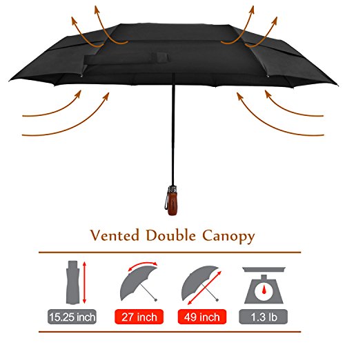 - WATER REPELLENT FABRIC AND LUXURY REAL WOODEN HANDLE: This large umbrella is made with 210T fabric with a specialized Dupont Teflon coating, making it water repellant and fast-drying. Also, the ergonomic real wood handle with finger-notches makes it comfortable to hold and easy to grip.A perfect windproof golf/travel/business umbrella for you.