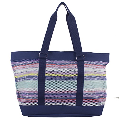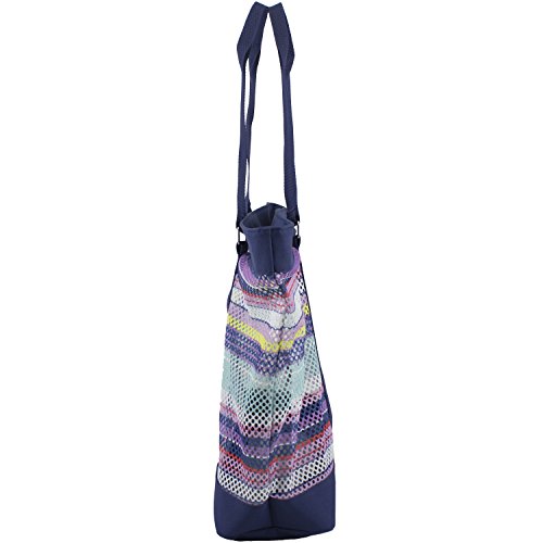 Details: Go for the casual, eye-catching fun Mesh Beach Tote Bag. This cool tote is constructed of sturdy polyester and a transparent mesh pattern throughout the body, with a thick, solid-colored polyester mesh reinforcing the base and double straps. The solid pocket keeps your valuables out of sight. It has a metal magnet closure to fully secure items. You can use this cool mesh tote as a purse or to carry anything you need for the day-beachwear, towels, books, extra clothes, or anything else you can think of.