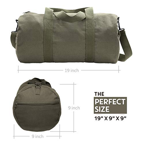 Versatile canvas duffel bag. It has a heavyweight cotton canvas pocket, adjustable shoulder strap, and web carry handles. The medium measures 19" by 9," while the large measures 24" by 12". It has an enormous main compartment that can fit your weekend's worth of goodies, or daily activities. It is great for school, work, traveling light, and many more.