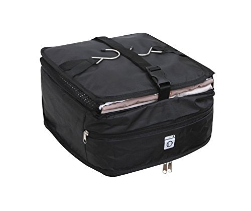 Details: Save space, stay organized, keep clothes wrinkle-free and clean! Make packing and unpacking easy and efficient! 3-tiered portable shelving & travel organizer with high strength steel hooks keeps clothing tidy and pressed during travel. Compartments for clothes, underwear, shoes, and dirty cloths. Just hang; load; collapse & latch; Stow-N-Go. Makes unpacking a breeze and acts as a portable shelving system when you travel. Hangs in closet or on shower curtain rod. Made from lightweight, but durable polyester fabric. Fits 20" and larger suitcases. Saves up to 30% of the available space in your suitcase. Zippered compartment at the bottom helps seperate clean clothes from dirties. Patent Pending Design. Measures 11.8" x 11.8" x 25.2"