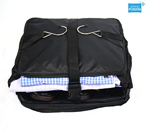 - 3-tiered portable shelving & travel organizer with high strength steel hooks keeps clothing tidy and pressed during travel. Compartments for clothes, underwear, shoes, and dirty cloths.