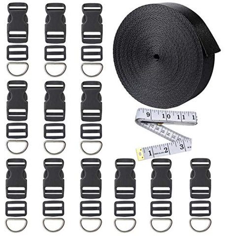 12 Yards Black Nylon Heavy Webbing Straps with 12 Set Plastic 1 Inch Flat Side Release Buckles, Tri-Glide Slides and D Rings for DIY Making Luggage Strap, Pet Collar, Backpack Repairing