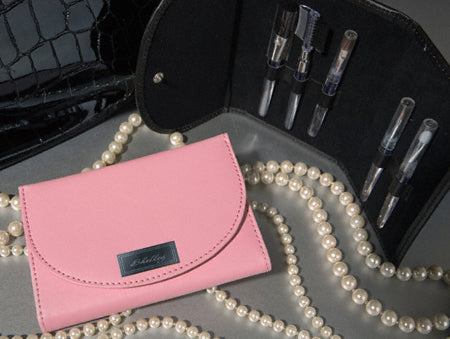 This handy personalized brush kit is ideal for a quick touch up night or day. Available in three colors and personalized on the front flap, our All Dolled Up Leather Make-up Brush Kit is made of genuine leather and includes a variety of brushes and applicators. With its tri-fold envelope style and snap closure, this kit conveniently fits into most purses, glove compartments or desk drawers. Measures 5 1/2" x 3 3/4" x 1" folded. Weighs 3 ounces. Select black, pink or red. Personalize with one line of up to 12 characters.
