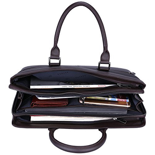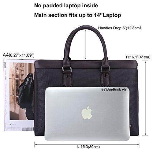 - Sturdy PU leather briefcase works greatly as a tote briefcase for business, travel or just everyday use. Main compartment can fit in Lenovo 14", HP 14", Macbook pro 15" or Macbook 15"; Size: 15.3 x 3.1 x 16.1 inch (39 x 8 x 41 cm). Net Weight: 0.84 kg