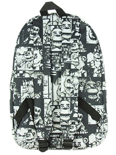 Details: This awesome backpack features a black and white Five Nights At Freddy's characters all over print. This backpack will carry what you need plus get the nods or thumbs up from everyone you come across who loves the game!