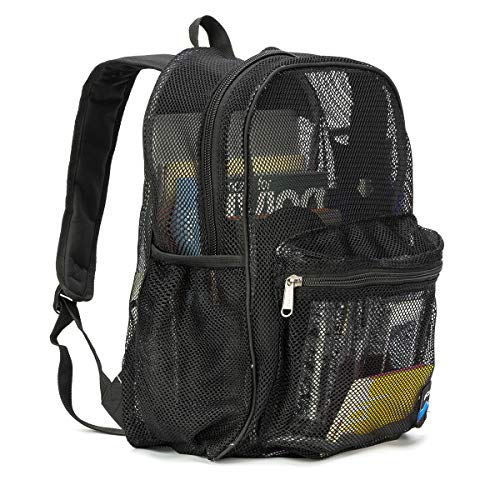 Details: High Quality Mesh Backpack with large quality zipper on main compartments. Dimension: 17"(H) x 13"(W) x 5.5"(D). Heavy Duty See Through Student Mesh Backpacks with zippered front pocket, Premium Transparent Net Basic Students Bookbag pocket on both sides. Deluxe Classic Mesh Daypack with Adjustable and padded shoulder straps and handle for easy carrying. Super Durable Quality Mesh School Bookbags made with heavy duty mesh material.