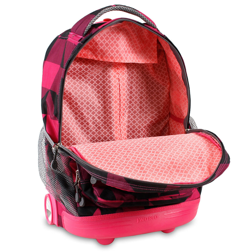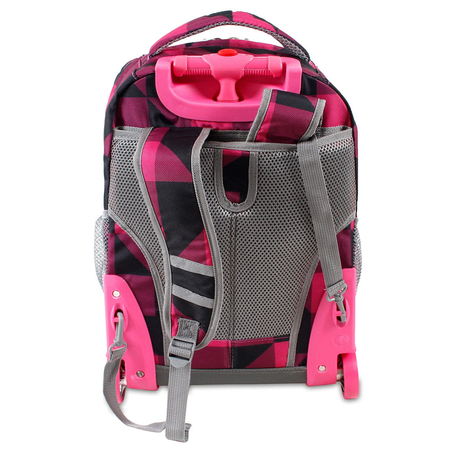 - J World New York Sunrise 18-inch Rolling Backpack - Block Pink Black Plaid Polyester Adjustable Strap Lined Water Resistant