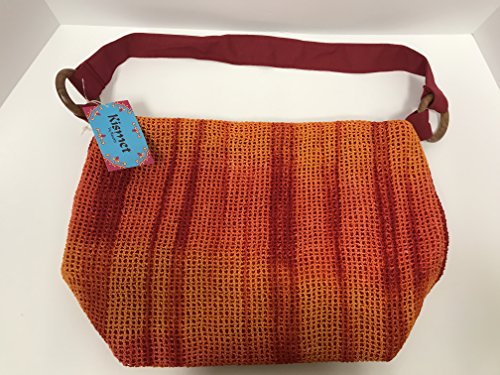 Details: Kismet Blue Crochet Handbag Color Blue Tie Die Interior Zip Pocket Zip closure Blue Cotton lining Canvas Shoulder Strap 13" wide; 12" tall at center; 7" with 11" drop strap Buying tip: Compare measurements against a bag you have on hand.
