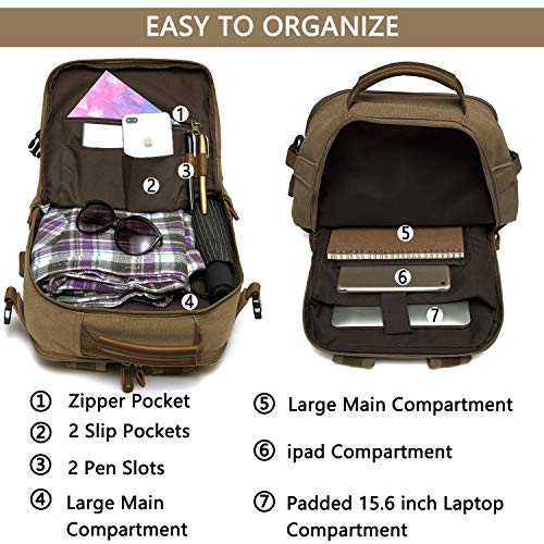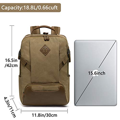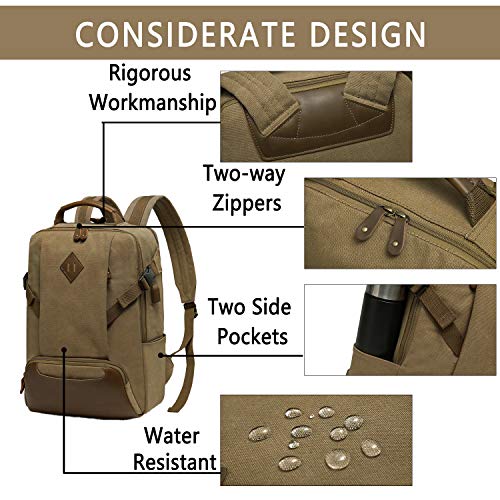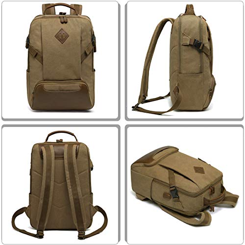 - ▲ High Quality: Perfectly combined with vintage outlook and durability, this vintage backpack functionally shows its two main large compartments with plenty of interior and exterior pockets. This Kasqo college backpack is sturdy and eco-friendly with the water-resistant canvas. Front faux leather magnetic button pocket and the adjustable side buckle strap nicely maintain its fashion. You could charge your phone through the USB charging port on-the-go.