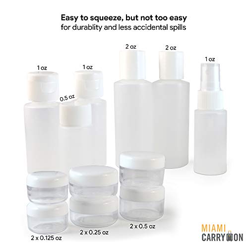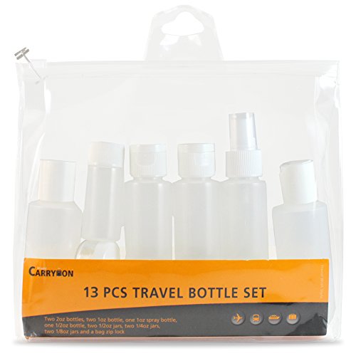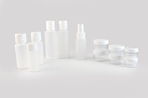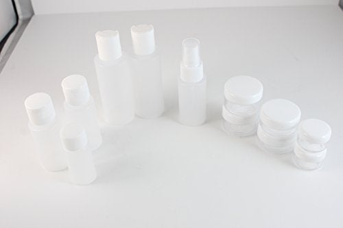 - Set Includes: 2 x 2oz Bottles, 2 x 1oz Bottles, 1 x 1oz Spray Bottle, 1 x 0.5oz Bottle, 2 x 0.5oz Jars, 2 x 0.25oz Jars, 2 x 0.125oz Jars and zip lockable bag. semi-transparent plastic reliable travel bottles with screw caps that are lined to prevent leaks.