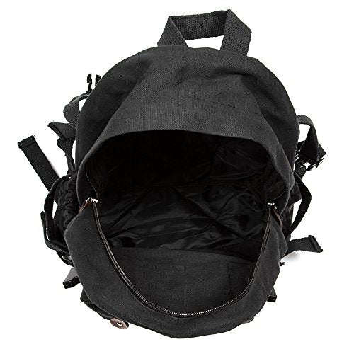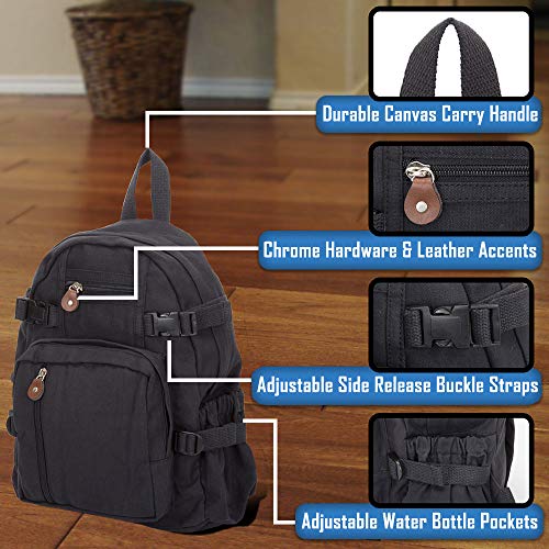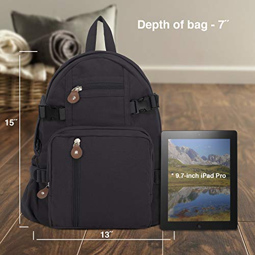 Versatile vintage canvas backpack. The bag has a main compartment that easily holds notebooks, supplies, books, and all your other daily necessities. The small size backpack can hold a 12-inch laptop, while the large size backpack can hold a 15-inch laptop. This bag features washed cotton canvas material, padded shoulder straps, 3 front zippered pouches, one main compartment, 2 side pockets with elastic and tie-down straps, and a top carry handle.