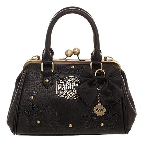 Details: Discover the futuristic old west world of Westworld. There are no limits here. The Westworld Mariposa Saloon handbag has the Mariposa Saloon logo centered with a Westworld keychain with a bow. The Kiss Lock makes accessing and closing this handbag extremely fast and convenient.