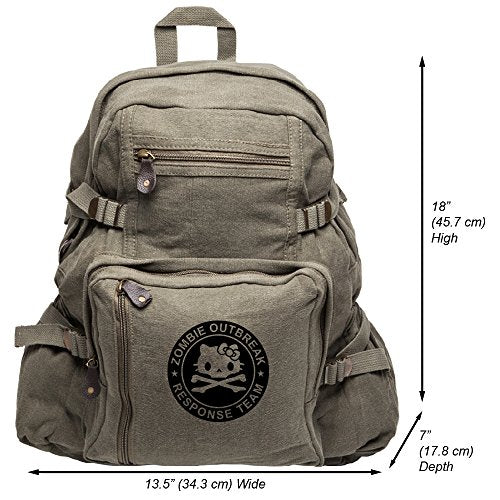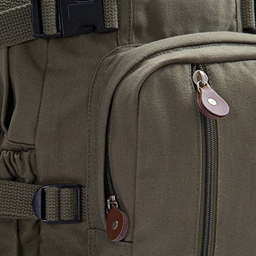 Versatile vintage canvas backpack. The bag has a main compartment that easily holds notebooks, supplies, books, and all your other daily necessities. The small size backpack can hold a 12-inch laptop, while the large size backpack can hold a 15-inch laptop. This bag features washed cotton canvas material, padded shoulder straps, 3 front zippered pouches, one main compartment, 2 side pockets with elastic and tie-down straps, and a top carry handle.