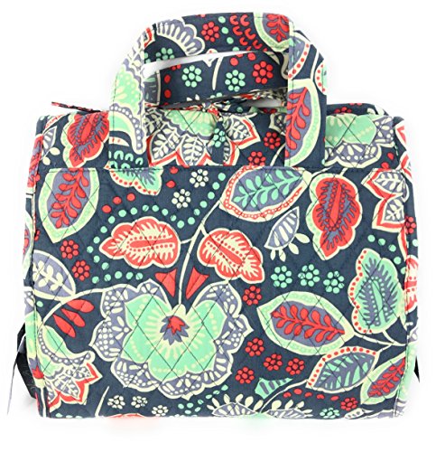 - Top zippered, quilted compartment plus two lined, clear plastic compartments