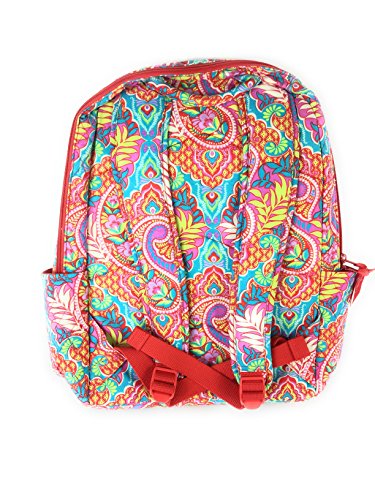 Details: A favorite of students and professionals alike, Vera Bradley has updated this tech-friendly backpack style with solid color linings, and a velcro padded laptop sleeve now inside the back of main compartment (it fits most 15 inch laptops. Hint - measure your laptop screen diagonally to determine size). The roomy interior can also house binders, folders and books, and there are plenty of pockets for organization. The front zippered compartment features two open slip pockets and an inner zippered pocket - all the necessities are organized and secure. There are dual 28 inch long adjustable and padded shoulder straps, as well as a top handle. It measures approximately 12 inches (W) x 17 inches (H) x 6 inches (D). Machine wash cold, gentle cycle, only non-chlorine bleach as needed, line dry. Patterns with solid color interiors are designed and produced for Vera Bradley Outlet stores.