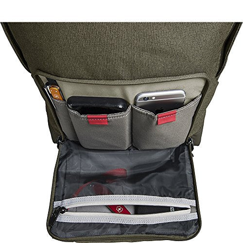 - Front zippered organizational panel features padded storage slots for peripherals, a pen slot and a bottle opener