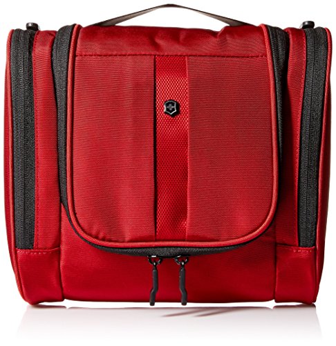 Details: Bring all of your full-size toiletries on an extended trip with this large hanging toiletry kit. Large main compartment features mesh divider, zippered pocket and pocket with easy-to-clean antibacterial lining helping to prevent the growth of odor-, mildew- and mold-causing bacteria. Zippered side pockets with water-resistant finish and loops for toothbrush, toothpaste, razors and shower bottles. Top hook displays kit from shower bar or towel rack and tucks away when not in use. Top grab handle allows for easy carrying
