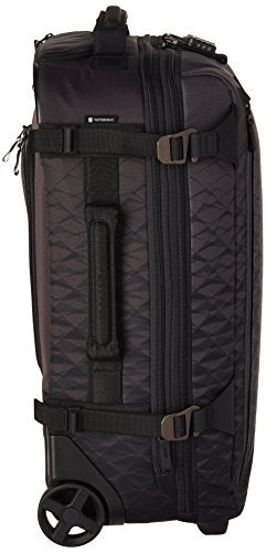 Details: Designed for adventure, this carry-on size wheeled duffel is lightweight and full of function. One-touch, monopole handle system with ergonomic comfort grip locks into three different positions - 94 cm (37"), 99 cm (39") and 104 cm (41") - to accommodate travelers of various heights and zips away when not in use. Compact design of the monopole handle allows for maximum utilization of interior packing space. Inline wheels for a smooth and stable roll. Spacious main compartment with large U-shaped opening expands 3 cm (1.1") for additional capacity. Interior organization includes Y-shaped webbing compression straps, a large zippered mesh lid pocket and a zippered mesh side pocket containing a key fob and storage slots. Exterior organization includes a padded front compartment sized to hold up to a 15.6" laptop, a zippered quick-access side pocket and two rear, easy-to-clean, wet/dry pockets ideal for storing running shoes or dirty clothes. Adjustable side compression straps with durable Hypalon attachments cinch to stabilize heavy loads. Rear skid plates provide protection to areas most prone to abrasion. Removable attach-a-bag strap secures an additional bag to the front of the duffel and holds up to 13.6 kg (30 lbs). Top and side haul handles and bottom grab slot for easy carrying. Lockable zippers with Hypalon pulls. Removable luggage tag. Travel Sentry Approved combination lock secures belongings and allows airport security screeners to open the lock without destroying it and relock it after inspection. Access Lock Combination Recovery Program allows you to register your lock combination on victorinox.com and recover it if it is ever forgotten. 5.71 lbs / 2.59 kg. 2624 cu in / 43 l (expands to 2868 cu in / 47 l)