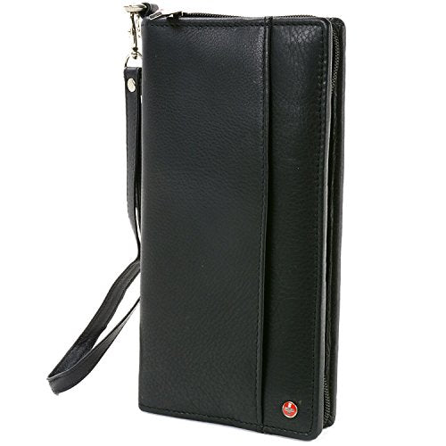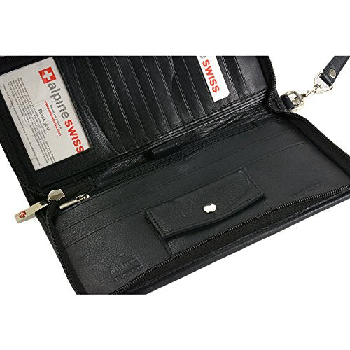 Details: Zippered Travel Passport Wallet This is a perfectly designed case for your travels. Get a beautiful and functional wallet with the peace of mind of knowing where your important documents are at all times. This item is also great for everyday use if you are looking for a larger wallet to replace a purse or a clutch bag. MSRP $95.00 Product Features: Soft and durable Genuine Leather Measurements: 9" x 5" x 1" Zip Around Closure for security Comes with Removable handle Many Inside Pockets to Carry: Currency & Credit Cards Airline Tickets & Boarding Passes Checkbooks & Traveler's Checks Multiple Passports for the whole family 2 Picture ID windows Loose Change Rail/Train Passes All you need to travel with organized and Safe Outside pocket for easy access to documents you need right away Pen holder Inside Zippered safe pocket 5 full size pockets for all your travel documents ID window and 12 card slots Comes in Alpine Swiss Giftbox Alpine Swiss donates 2500 meals every day to hungry children in the U.S. and around the world through our partnership with Children’s Hunger Fund. These meals are hand delivered in a Food Pack, which will contain enough food to feed a family of 4-5 for a week to the homes of the needy by trained volunteers in their community, establishing relationships that foster genuine care. Your purchase fuels this effort! Thank you!