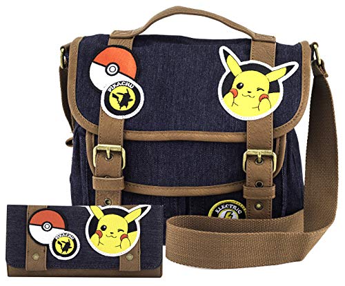 Details: POKEMON PIKACHU DENIM CROSSBODY WITH FAUX LEATHER TRIM AND TWILL AND EMBROIDERED PATCHES. MEASUREMENTS: W: 10.5" X H: 9.5" X D: 2". DENIM TRIFOLD WALLET WITH FAUX LEATHER TRIM AND TWILL AND EMBROIDERED PATCHES. MEASUREMENTS: W: 8" X H: 4".