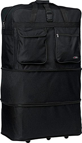 Details: Material - 600D Polyester construction. Main compartment opens with twin zipper closure. Reinforcing strap. Three levels foldable. Comfort-grip carry handle. Adjustable and Removable shoulder strap. Two front pockets for last-minute storage. Collapses to 4" D. when not in use. Five sturdy 360° swivel wheels for easy rolling. Bag body can be expanded by zippers from 20" to 30" to 40" high. Product Details: 40" Black Rolling Wheeled Duffel Bag Spinner Luggage Dimension Constructed: 24.5" L x 14.5" W x 20" H (Check in size, 59 linear inches) Dimension Expand half way: 24.5" L x 14.5" W x 30" H Dimension Expand all the way: 24.5" L x 14.5" W x 40" H Weight: 6 lbs