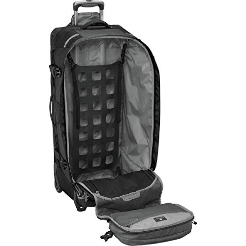 - Innovative Equipment Keeper holds gear to top of bag tightly; the Cargo Net is utilized for both internal compression or outside gear attachment; multi-point grab handles to carry your luggage several ways; over-sized treaded wheels with heavy-duty wheel housings for effortless, smooth rolling; rear skid plates offer protection
