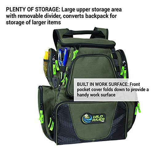 Details: Multi-Tackle Large Backpack With Two #3600 Style Trays. Lower tray compartment for storage of up to four #3600 style trays. Large upper storage area with removable divider, converts backpack for storage of larger items. Front pocket cover folds down to provide a handy work surface. Large adjustable padded shoulder straps with sternum strap for all day comfort and fit. Clear internal pocket to keep your maps and licenses visible but dry. Capacity to hold up to six #3600 style trays and four #3500 style trays with the divider down. Front web loops for organization. Base pads to reduce wear and help keep bag clean and dry.