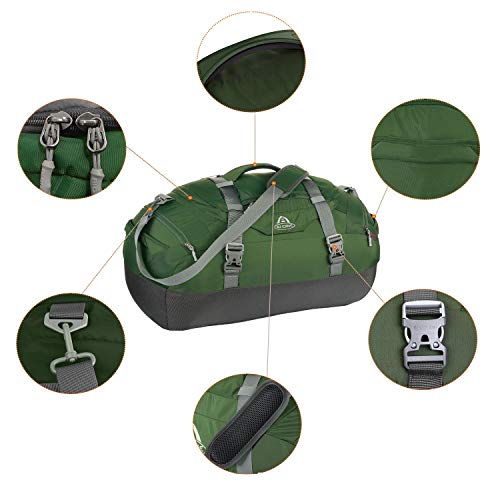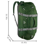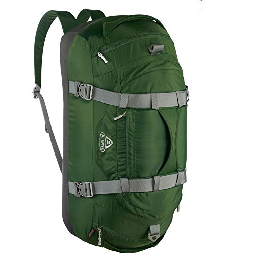- AIONE duffel bag backpack features Nylon 420D and 1000D(bottom) water and tears resistant fabric with PU coating. SBS zipper, YNS buckle, and reinforced stitching to withstand heavy-duty use. Dimensions: 31.9 x 16.9 x 15.8 inches with 65L (8517 cubic inches) capacity.