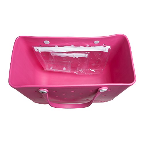 • X-Large (19x15x9.5) tote holds up to six large towels with room for snacks, suntan lotion and more. INCLUDES 2 clear accessory bags that pop into the holes anywhere inside or outside of the bag to keep smaller items within reach.