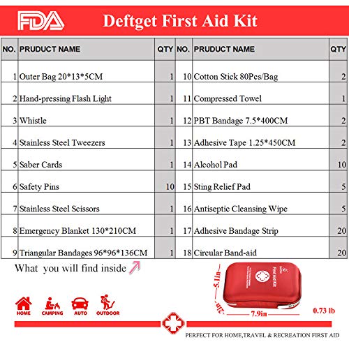Details: DEFTGET FIRST AID KIT: FULLY EQUIPPED FIRST AID KIT FOR THE BEST CONVENIENCE! Do you spend a lot of time working outdoors or in an environment where injuries are common, and often find you don't have the full range of first aid equipment to deal with a range of potential problems, quickly and with little hassle? IF so, We have created the perfect first aid kit for you! - Small and lightweight so you can carry it with you anywhere you go, or leave it at home, or in your car. - Complete so you have the emergency essentials you need and want. WHAT'S INSIDE THE DEFTGET FIRST AID KIT? It comes with 163 good quality items, exactly what you need for pretty much any minor emergency: ● 1. Bandaids 20pcs ● 2. Alcohol Prep pads 10pcs ● 3. Iodine pad 5pcs ● 4. Nonwoven Triangular Bandage 96x96x135cm 1pcs ● 5. Emergency Blanket 130x210cm 1pcs ● 6. PBT medical bandage 7.5x400cm 2pcs ● 7. Sting Relief Pad 5pcs ● 8. Non-woven adhesive tape 1.25×450cm 2pcs ● 9. Stainless Steel Tweezers 1pcs ● 10. Stainless Steel Scissors 1pcs ● 11. Compressed Towe 1pcs ● 12. First Aid Kit 20x13x5cm 1pcs ● 13. Whistle 1pcs ● 14. Safety pins 10pcs ● 15. hand-pressing flashlight 1pcs ● 16. Saber Cards 1pcs ● 17. Circular Band-aid 20pcs ● 18. Cotton Stick 80pcs Note: BE PREPARED: SAVE MONEY AND TIME. These kits are selling out fast and soon we may be run out of stock. Make a smart decision.