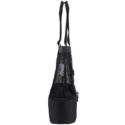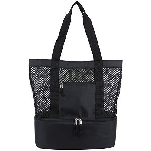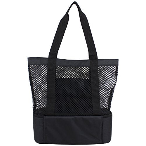 Details: Go for the casual, eye-catching fun Mesh Cooler Beach Tote Bag. This cool tote is constructed of sturdy polyester and comes in multiple colors. This bag has a thick, solid-colored polyester mesh reinforcing the base and double straps. The solid front zip pocket keeps your valuables out of sight. It has a metal magnet closure to fully secure items. Best part of this bag is the cooler bottom for your beverages and snacks, perfect for on the go. You can use this mesh tote as a purse or to carry anything you need for the day-beachwear, towels, books, extra clothes, drinks, food or anything else you can think of.