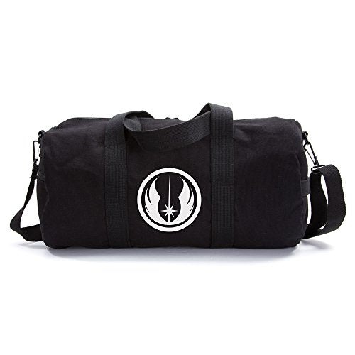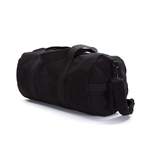 Versatile canvas duffel bag. It has a heavyweight cotton canvas pocket, adjustable shoulder strap, and web carry handles. The medium measures 19" by 9," while the large measures 24" by 12". It has an enormous main compartment that can fit your weekend's worth of goodies, or daily activities. It is great for school, work, traveling light, and many more.