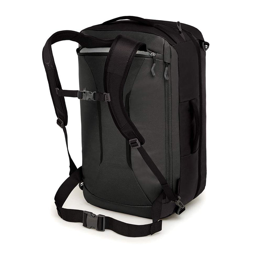 Details: The Osprey Transporter carry-on bag is versatile, durable, and ready for whatever lays ahead for travelers on the move. Built to fit most domestic airline carry on rules, this travel backpack can be carried either by the padded side handles, with the included shoulder strap or even as a backpack when the straps are deployed. It also has a pass-through sleeve on the back panel that enables the bag to slip over wheeled luggage handles. This briefcase style luggage opens fully flat for easy packing. The bottom portion has a zippered mesh cover and compression panels to hold clothes flat and reduce wrinkles. The top portion is covered by fabric, perfect for an extra pair of shoes or dirty clothes. Other travelling focused features include external zip access to a toiletry pocket and two zippered mesh Interior pockets. This pack is perfect for work travels thanks for the rear panel access padded laptop sleeve (fits up to 17 inch), the hidden RFID security pocket, and the front panel organization pocket for pens, business cards, and more.
