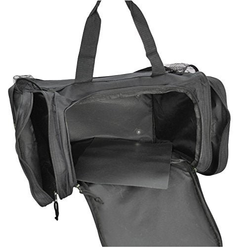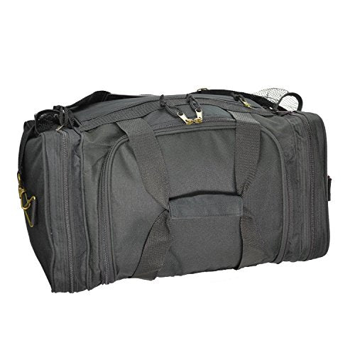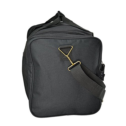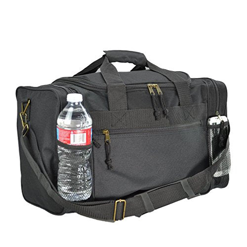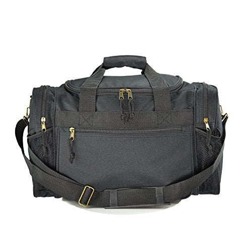 Details: FEATURES: Large side zippered pocket, end zippered & 2 mesh pockets. Adjustable Strap MATERIAL: 600D Polyester SIZE: 17" X 10" X 9" COLORS: Black, Black/Royal, Black/Red, Black/Dark Gray INTENDED USE: Gym, Sports, Travel, Carry-on, Luggage, Camping, Hiking and More!