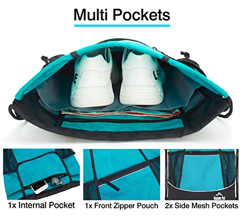- 【Large Capacity and Multi Pockets】- This drawstring backpack features one main compartment and 5 separate pockets.One inner wet pocket for wet clothes.One front zipper pocket for small items.Two Side mesh pockets for water bottle and one interior divider helps separate your gear.Dimensions are 17.5" х 14.5".