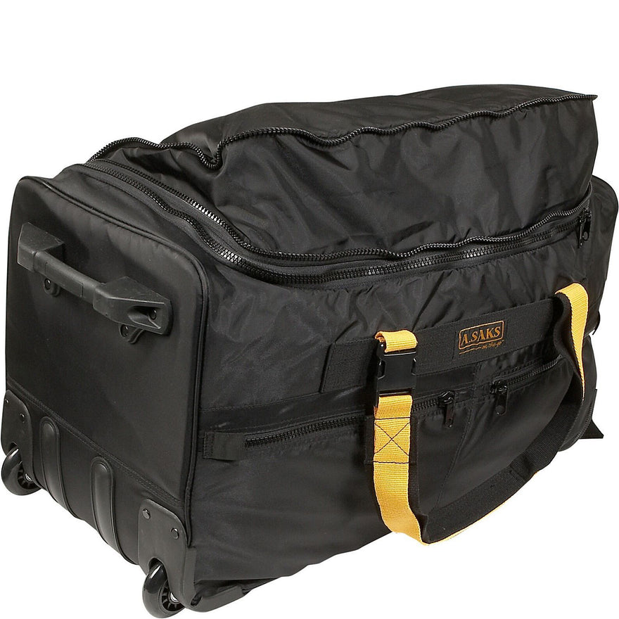 The A. Saks Expandable 25" Rolling Trolley Duffel bag is made from nylon fabric and features a sporty design with expandable construction, two top handles for easy lifting, a telescoping pull handle, and smooth rolling in-line skate wheels that make it easy to maneuver. This duffel bag has a large main compartment with a zip around top closure and tie-down straps that hold garments in place. Two exterior pockets offer added storage for toiletries, small accessories, and personal items that you need to keep within easy reach.