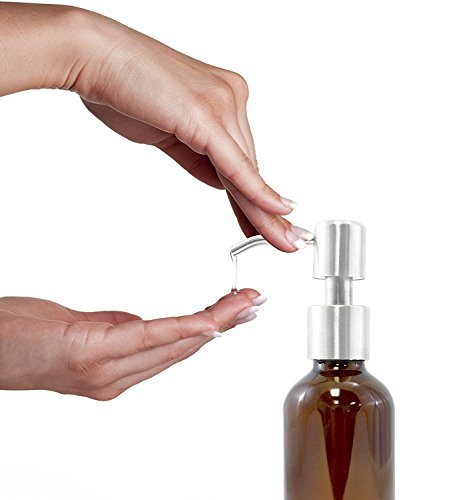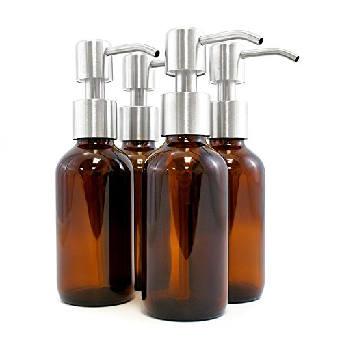Details: Amber Brown 4-Ounce Boston Round Glass Bottles with Stainless Steel Pump Nozzles (4 Pack); Empty Multi-Purpose Bottles Ideal for Lotion & Liquid Soap