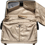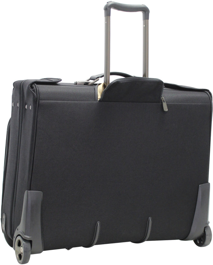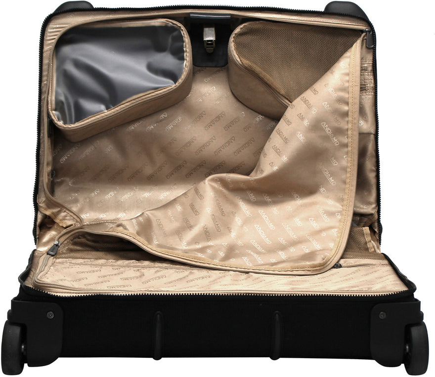 Andiamo Avanti Wheeled Wardrobe is constructed with the finest quality DURAMAx ballistic nylon. Has 2 durable high-mile wheels for maximum maneuverability on all terrain. Fully featured garment bag with Wally clip, zippered pockets for small items, durable hanger for closet placement. Roomy front pocket, multiple zippered pockets, leather ID tag and luxurious lining to protect your belongings.