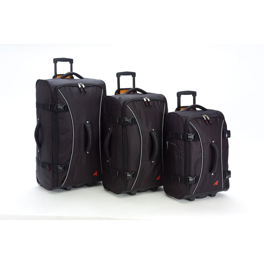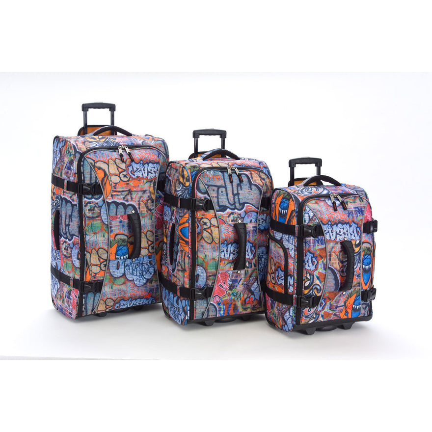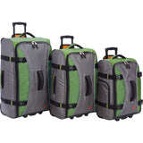 The Athalon Wheeling Hybrids 3PC Set blends the styling of sporty duffel bags with the details of durable pullman bags. The set consists of 3 sizes - 21", 26" and 29"The Athalon Hybrid Travelers feature solid colors and bold graphic prints on poly/nylon fabric with contrast piping, in-line skate wheels for easy mobility, and ergonomic handles on the top, front, and side that make it easy to lift on and off luggage carts and baggage carousels. Each bag has a wide zipper opening with a contrast lining, interior tie-down straps to keep garments secure, a zippered mesh lid pocket for small items, open mesh pockets for delicates, and elastic pockets for shoes.