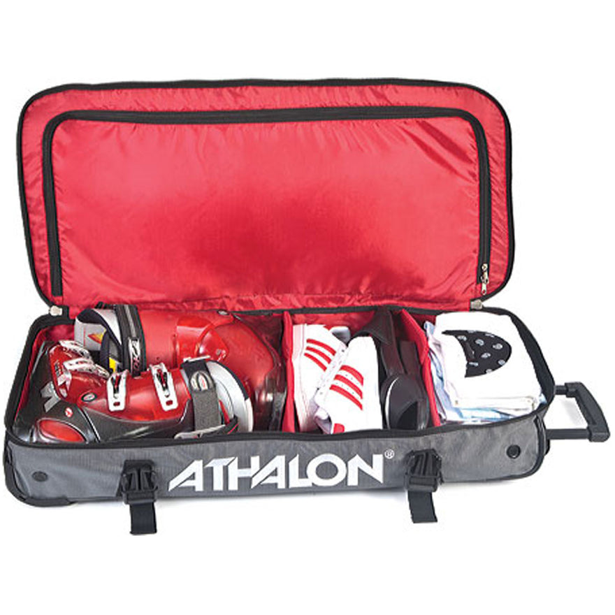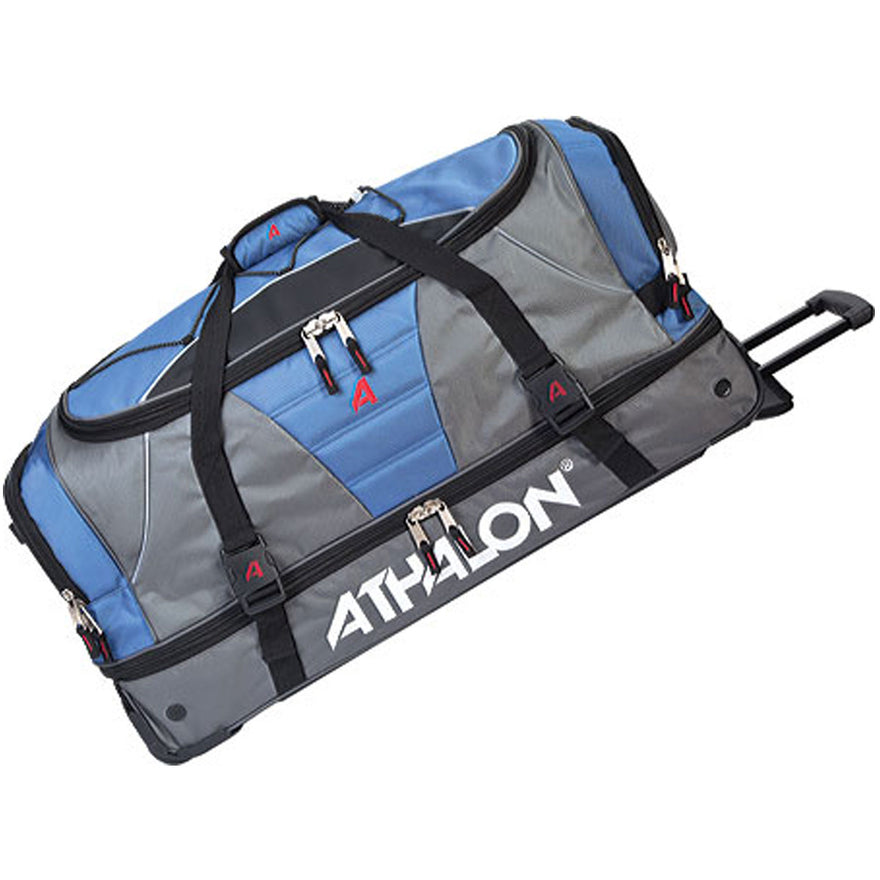 Keep all your travel essentials stylishly stowed and neatly organized in the Athalon Sportgear 32" Over/Under Wheeling Duffel. This lightweight and durable polyester and nylon blend wheeled upright suitcase features logo embroidery and a compact, structured design, and it's available in several colors. Its spacious, zippered interior has a convenient u-shaped opening and contains an over/under section that separates your shoes or boots, laundry, and equipment from your clothing and accessories. Its zippered trapdoor offers easy access to both compartments, and bungee cords on its top allow you to attach your jacket and extra gear. The Athalon Sportgear 32" Over/Under Wheeling Duffel comes with a hidden, telescoping pull-out handle with an ergonomic rubber grip for easy maneuvering.