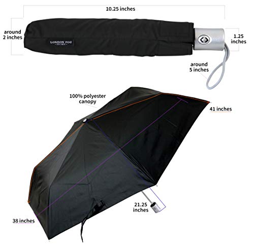 Details: One touch automatic open and close full-size canopy. 100% polyester. Lightweight, folds thin and comes with pouch. Packaged in a holiday box. 41 inch open arch, 10 inch folded length. The Self Closing feature is very helpful when getting into a car. Solid black.