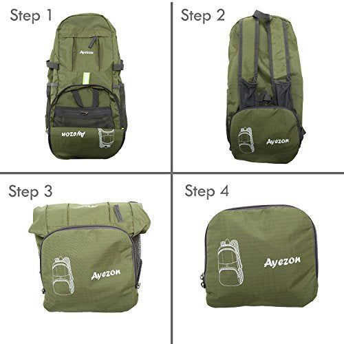 - [Multi-Purpose]: Ayezon Foldable Backpack folds up into the front pocket to save space, pull it out as a hiking backpack. Lightweight and 35L storage space great for travel, vacation, camping, shopping, walking, cruises for the beach, weekend outing and so on.