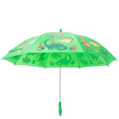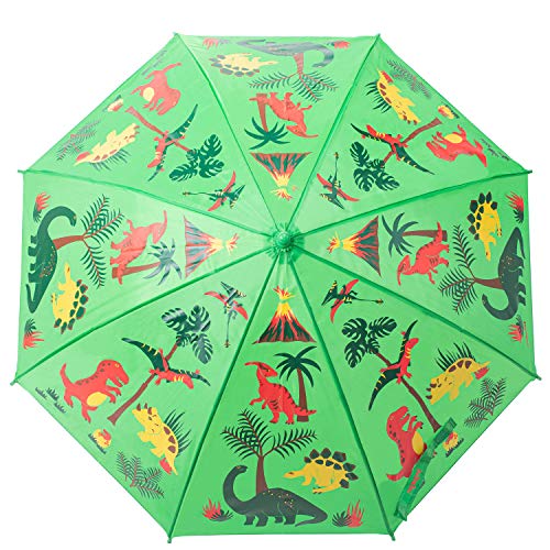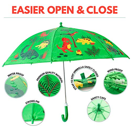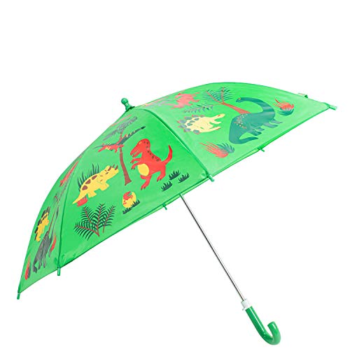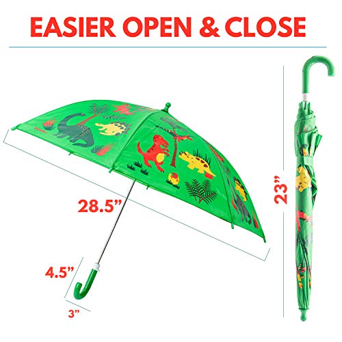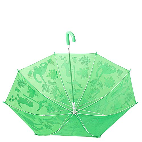 Details: Kids Umbrella - Childrens 18 Inch Rainy Day Umbrella - Dinosaurs. Kids will love to go outside on a rainy day with their very own little dinosaur umbrella! This nylon umbrella boasts a cute playful dinosaur, and an EASY child safe opening to not pinch little fingers. So let them go ahead and splash in the puddles. The umbrella is 18 inches of fabric (an inch longer than many children’s umbrellas) , and is made of bright nylon.