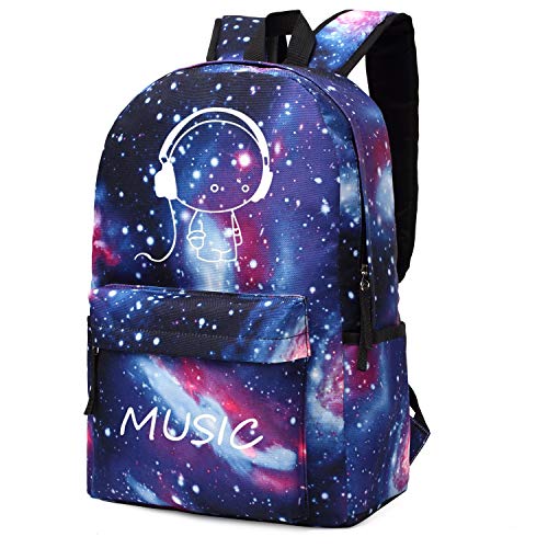 - Galaxy Backpack - Vibrant color, whimsical with galaxy pattern, and cute "Musician Boy" fluoresces in the dark, provided that enough light is absorbed during the day. You will look more stylish and fashion-forward while wearing it