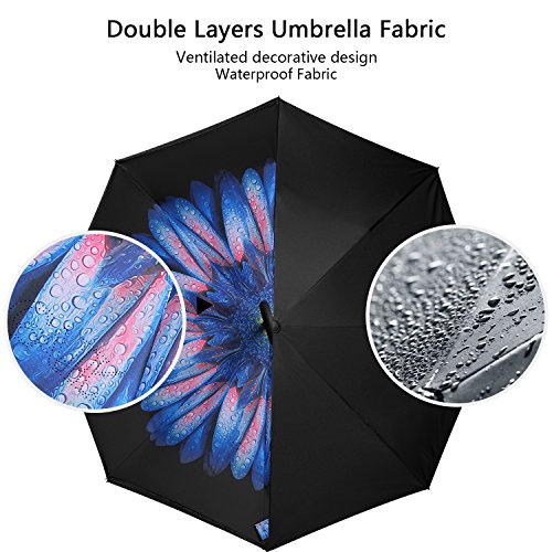 Unique design double layer inside out umbrella, make it easy for you on raining day, won't wet your car, documents or others. Advanced double layer ribs made the inverted umbrella more sturdy. 23 in X 8 Panels is large enough for Many People .