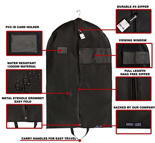 • BEST BAG ON THE MARKET: the most features combined in one bag!!!!! Included: bigger than standard size 26"wide, top quality rip resistant material, 5" gusset, #5 zipper, full length zipper, viewing window, metal eye hole, carry handles, PVC ID card holder, reinforced hanger opening, anti moth protecter