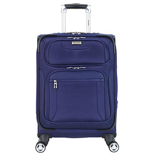 Details: It’s great to rest easy knowing your belongings are safe and secure in a soft side 22 inch 8 wheeled upright by Ricardo Beverly Hills. The durable exterior is constructed of a Terylene polyester fabric that helps resist abrasion and tearing while providing superior protection against the elements. The upright has a multi-stage retractable handle with a TPR comfort grip which offers optimal comfort and control. Effortless mobility with enhanced 360 degree double wheel system smoothly glides in any direction, enhancing stability and minimizing effort. The interior lid of the bag offers maximum organization with a mesh zippered pocket and two elastic top pockets to provide options for keeping items organized. The large, fully lined interior compartment features adjustable tie-down straps to help keep contents secure. The upright comes with a 2” expansion if needed for the time you need additional packing space. The upright comes in Black and Navy.