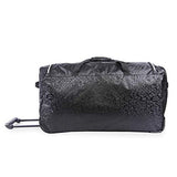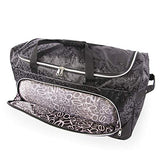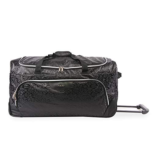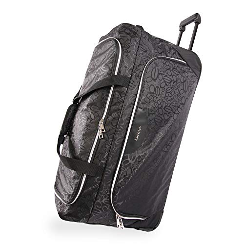 Details: Travel in style with your clothing and other essentials packed inside this chic 30" duffel bag by Bebe. With it's spacious main compartment, smooth gliding wheels and stylish prints, you will travel fashionably with ease.